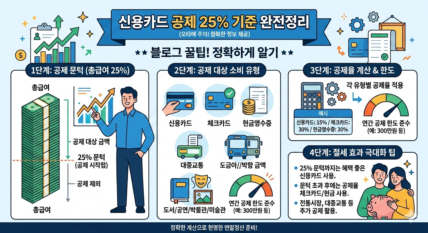 신용카드 공제 25% 기준을 정확히 이해하면 연말정산에서 불필요한 소비를 줄이고 합리적인 전략을 세울 수 있습니다.